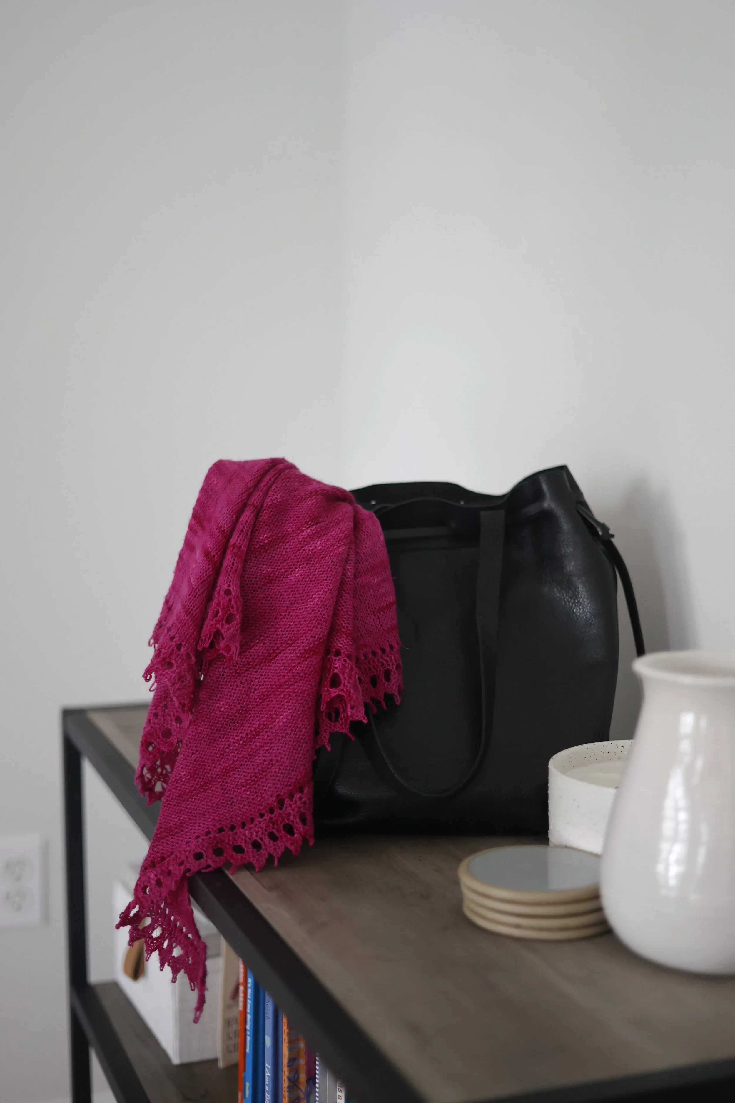 When you're on the go, add the shawlette to your bag as a chic accessory. Not only does it elevate your everyday bag and hide the mundane things you need to keep in there (don't ask me how many diapers are in there), you'll also have your new favorite shawlette handy in case you catch a chill.
